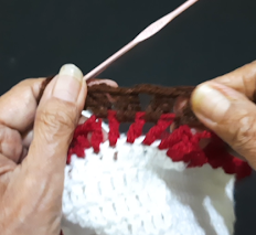 R5: With light brown color, (dc1 in 2 sts, ch6, skip 2 sts) 14 times, cl.